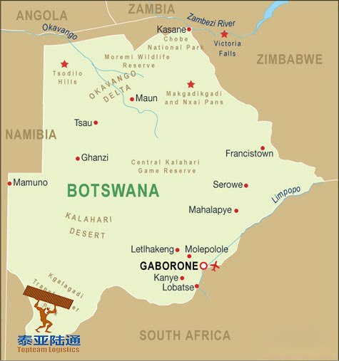 内陆国家多式联运专家,泰亚陆通专业提供从中国各港口到博茨瓦纳哈博罗内Gaborone,弗朗西斯敦Francistown,塞莱比-皮奎Selebi-Phikwe,洛巴策Lobatse,奥拉帕 Orapa等城市运输服务。