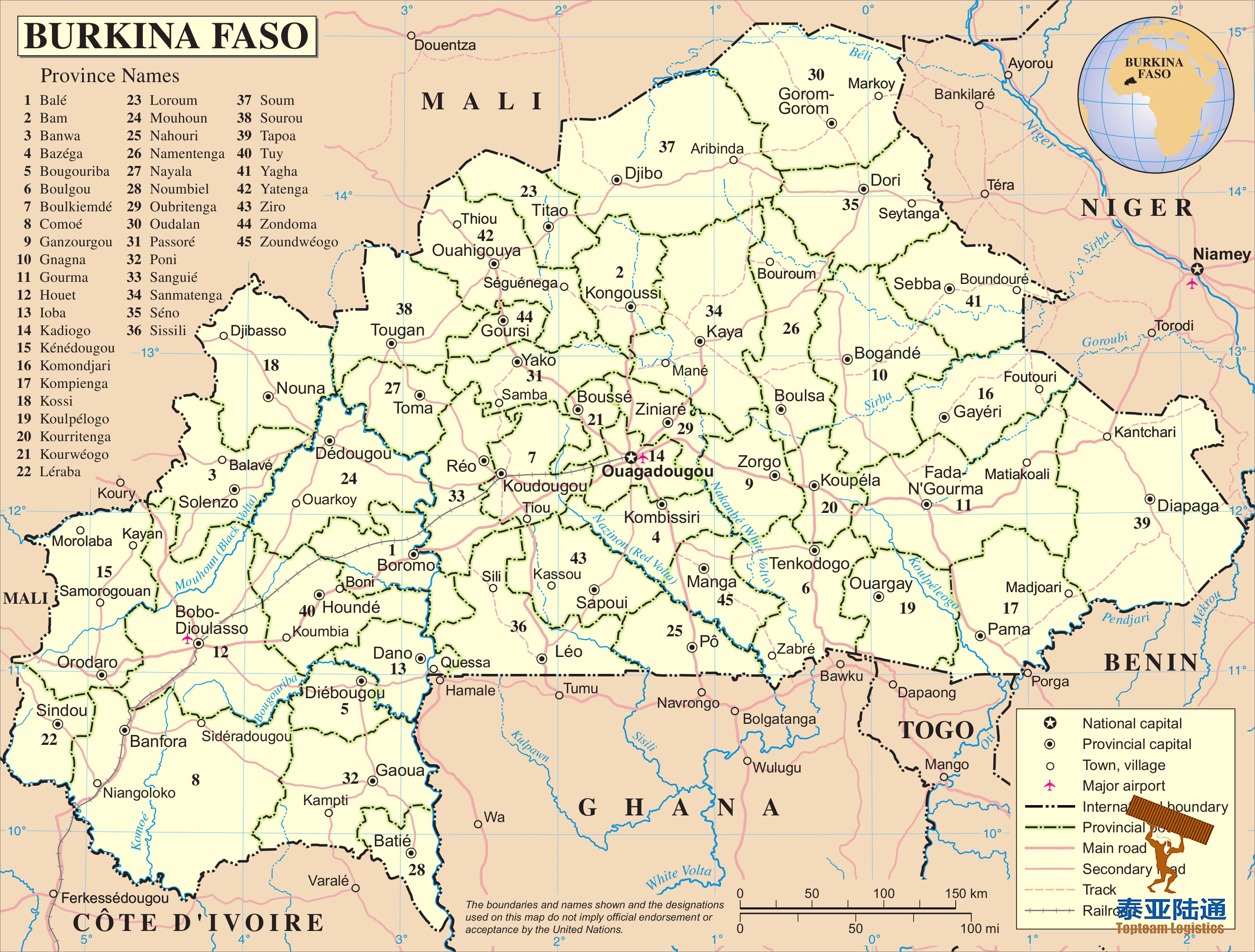 内陆国家多式联运专家,泰亚陆通专业提供从中国各港口到布基纳法索瓦加杜古Ouagadougou,巴雷Bale,巴姆省Bam,巴瓦Banwa,尼亚尼亚Gnagna等城市运输服务。