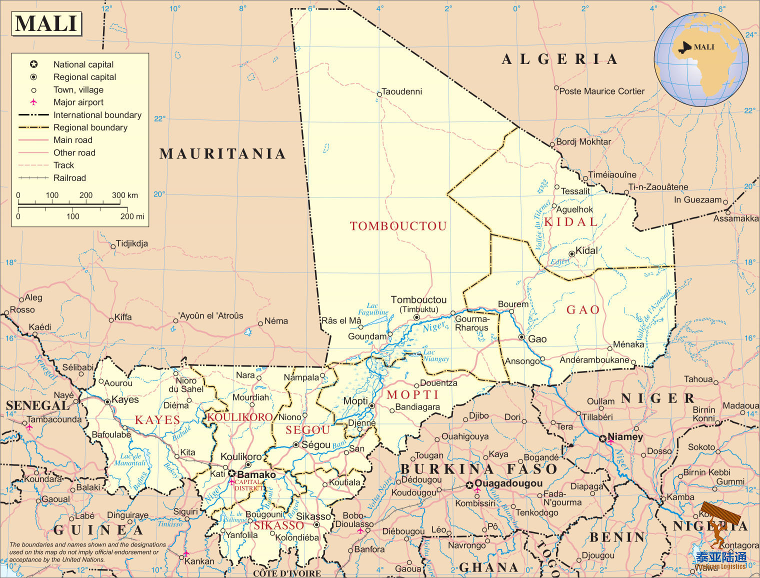 内陆国家多式联运专家,泰亚陆通专业提供从中国各港口到马里巴马科Bamako,卡伊Kayes,库里克罗Koulikoro,锡加索Sikasso,塞古Segou,莫普提Mopti,通布图Tombouctou,加奥Gao,基达尔Kidal,桑San,杰内Djenne等城市运输服务。