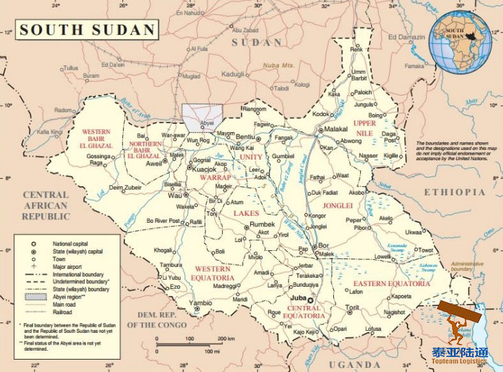 内陆国家多式联运专家,泰亚陆通专业提供从中国各港口到南苏丹朱巴Juba,伦拜克Rumbek,耶伊Yei等城市运输服务。