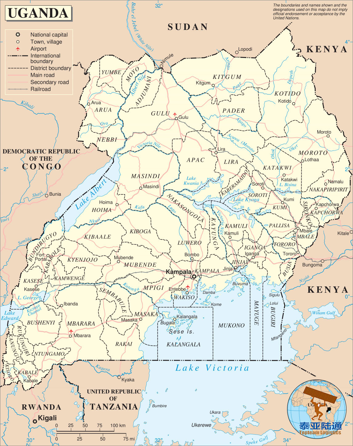 内陆国家多式联运专家,泰亚陆通专业提供从中国各港口到乌干达坎帕拉Kampala,卢韦罗Luwero,马萨卡Masaka,穆本德Mubende,卡兰加拉Kalangala,基博加Kiboga,瓦基索Wakiso,金贾 Jinja,古卢 Gulu,姆巴拉拉 Mbarara等城市运输服务。