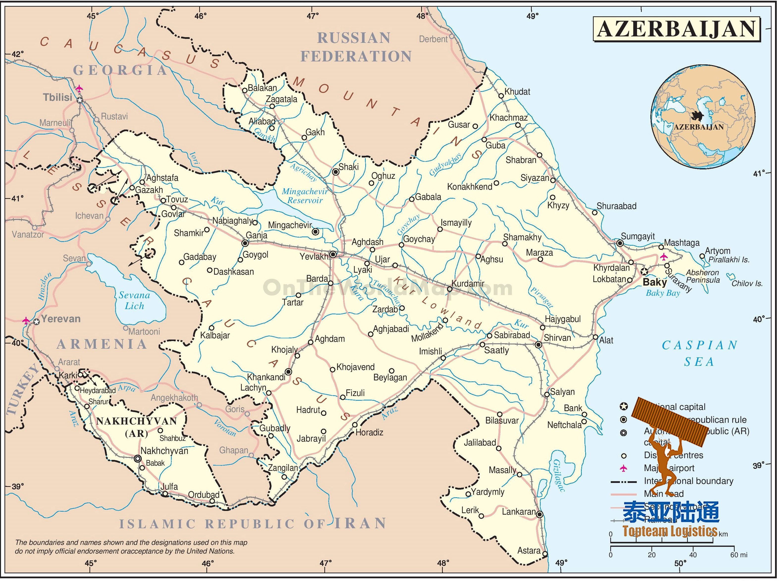 货物进入阿塞拜疆,都需要从第三国中转。多式联运专家,泰亚陆通专业提供中国各地起运,到阿塞拜疆巴库Baku,卡巴拉Qabala,托佑滋Tovuz,占贾/甘贾Ganja,明哥桥Mingecevir,苏姆盖特Sumgait,希尔凡Shirvan,纳希切万Nakhchivan,连科兰Lankaran,叶夫拉赫Yevlax,纳夫塔兰Neftalan等城市门到门运输服务。