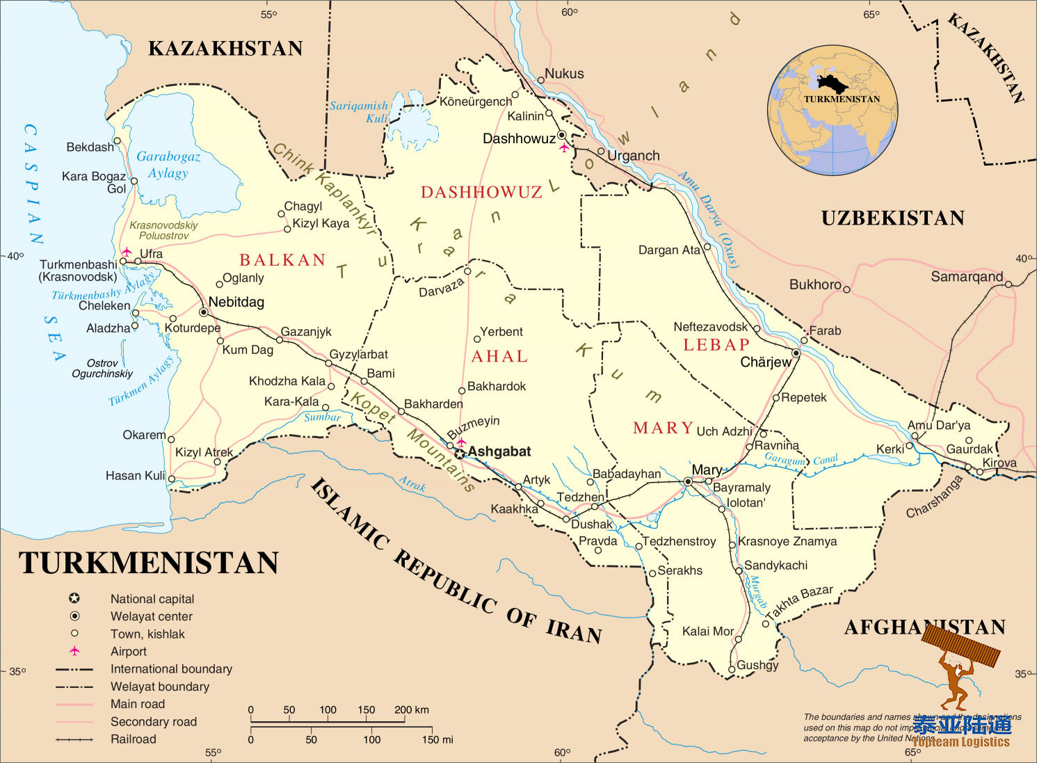 泰亚陆通专业提供中国各地起运到土库曼斯坦阿什哈巴德Ashgabat,马雷Mary,土库曼纳巴德Turkmenabat,土库曼巴希Turkmenbashi,巴尔坎纳巴德Balkanabat,法拉普Farap,达沙古兹Dashagouz,阿涅夫Anev等城市到门运输服务。