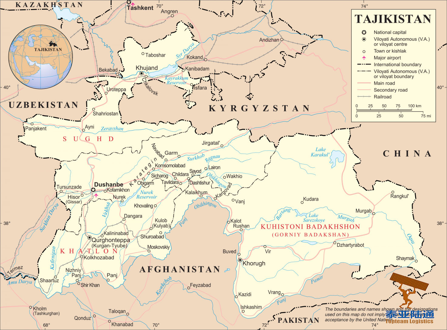 泰亚陆通专业提供中国各地到塔吉克斯坦杜尚别Dushanbe,彭吉肯特Panjakent,库尔干秋别Qurghonteppa等运输服务。