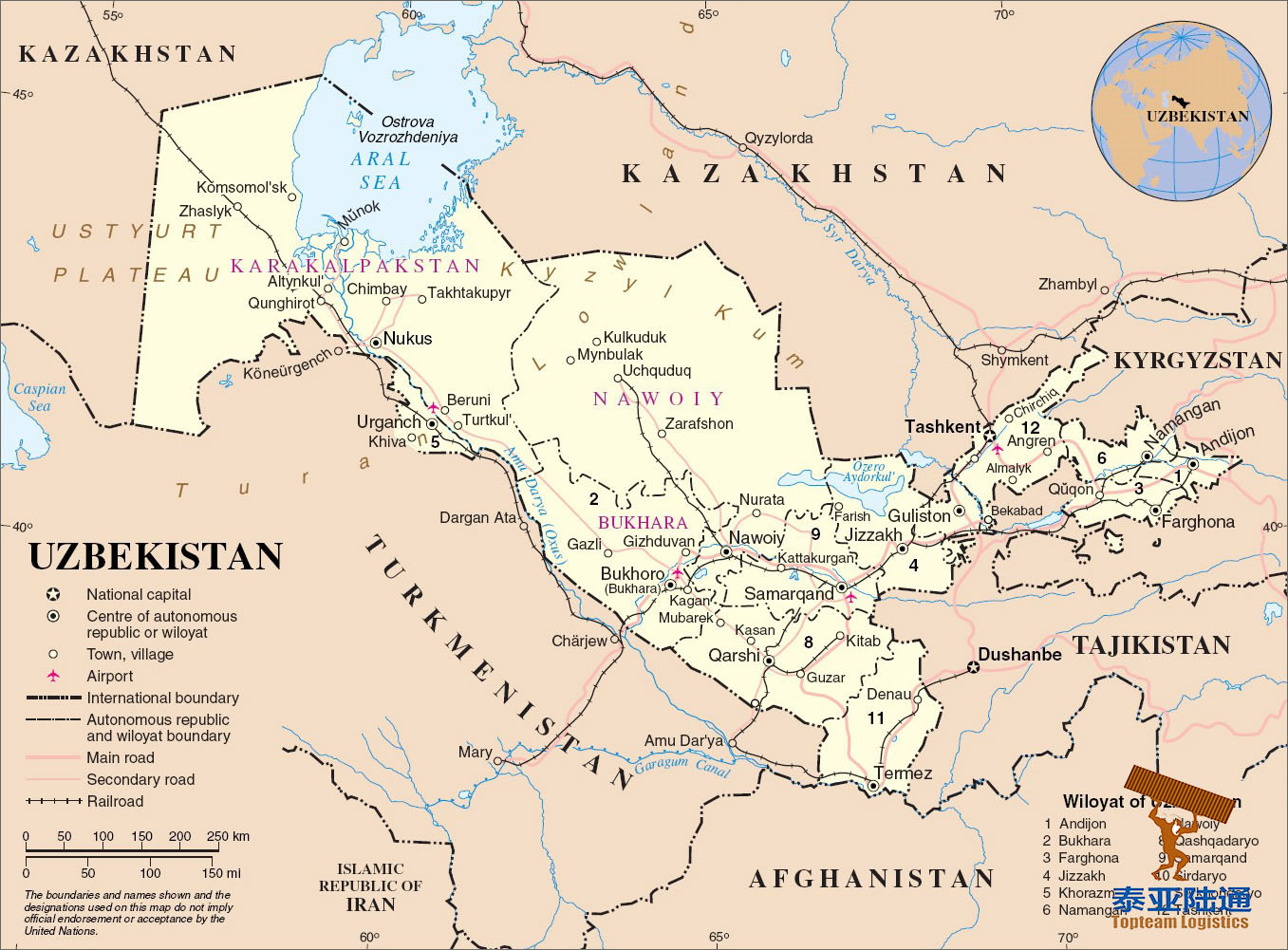 泰亚陆通专业提供中国各地到乌兹别克斯坦塔什干Tashkent,安集延Andijian,布哈拉Bukhara,齐尔奇克Chirchinik,丘库尔赛Chukursay,卡基尔Kakir,马尔兰吉Margilan,费尔干纳Fergana,乌尔根奇Urgench等城市运输服务。